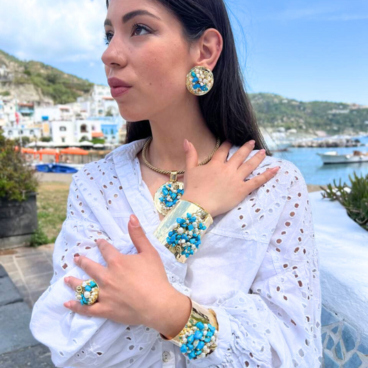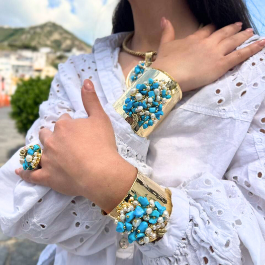 Ciondolo in Bronzo dorato con grappolo con Turchese e Perle. Misura grande