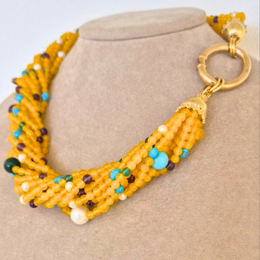 Collana a 12 fili in Agata gialla, Giada, Quarzo Ametista, Perle e sassi di Turchese naturale, chiusura in Argento 925 dorato