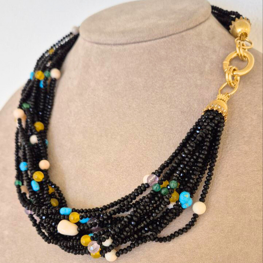 Collana a 15 fili in Spinelli neri sfaccettati, Corallo rosa, Giada, Quarzo Ametista, Perle e sassi di Turchese naturale, chiusura in Argento 925 dorato