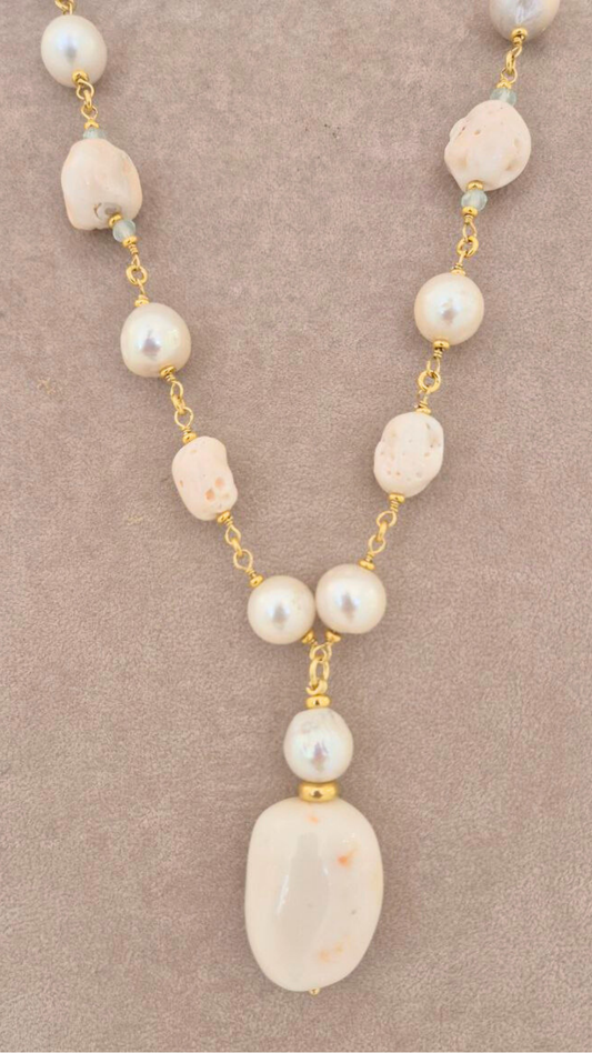 Collana in Corallo rosa, Perle e Quarzi azzurri, completamente ammagliata a mano in Argento 925 dorato