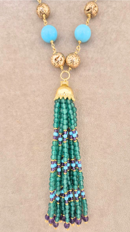 Collana in Pietre Naturali ammagliata completamente a mano, in Argento 925 dorato, con Pasta di Turchese, Pietra lavica, Giada e Ametista