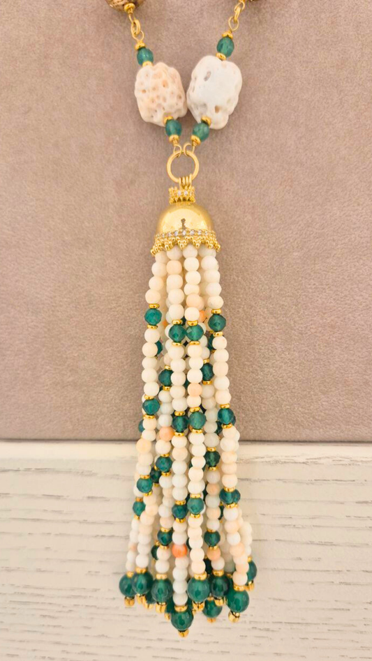Collana in Pietre Naturali ammagliata completamente a mano, in Argento 925 dorato, con Corallo rosa e Giada