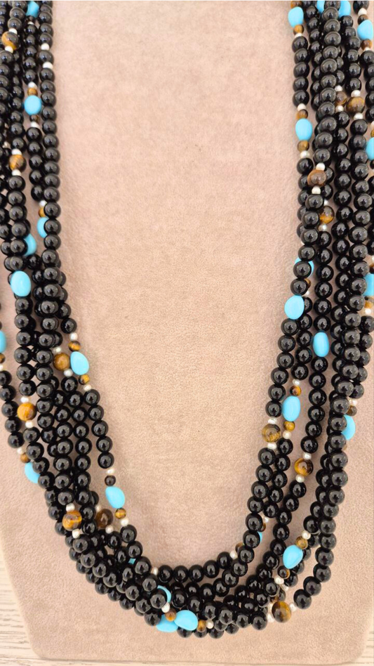 Collana a 6 fili in Onice, Perle, sassi di Pasta di Turchese e Occhi di Tigre, chiusura in Argento 925 dorato