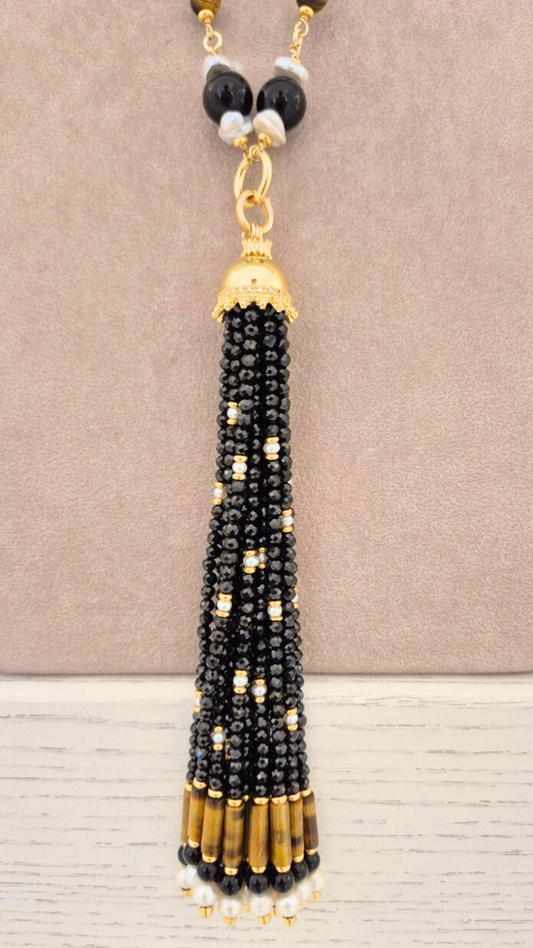 Collana in Pietre Naturali ammagliata completamente a mano, in Argento 925 dorato, con Onice, Spinelli neri, Perle e Occhio di Tigre e Onice