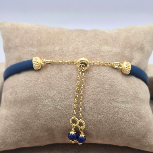 Bracciale in caucciù blu con inserti in Argento 925 dorato e bottoncino con pietra naturale a scelta. Chiusura con saliscendi