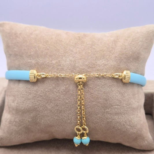 Bracciale in caucciù azzurro con inserti in Argento 925 dorato e bottoncino con pietra naturale a scelta. Chiusura con saliscendi