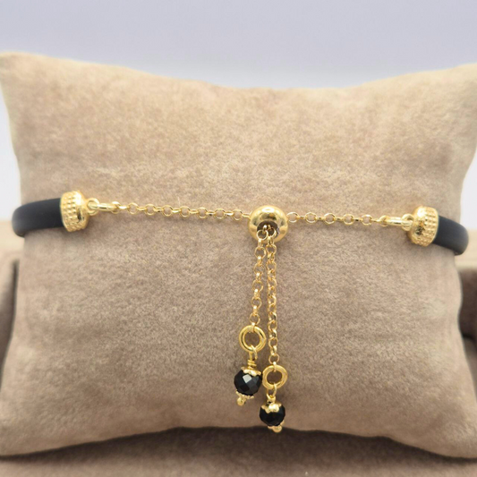 Bracciale in caucciù nero con inserti in Argento 925 dorato e bottoncino con pietra naturale a scelta. Chiusura con saliscendi