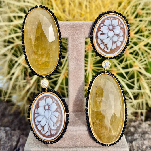 Orecchini in Argento 925 dorato asimmetrici con Cammei ovali su Sardonica, Radice di Zaffiro e giri di Spinelli neri