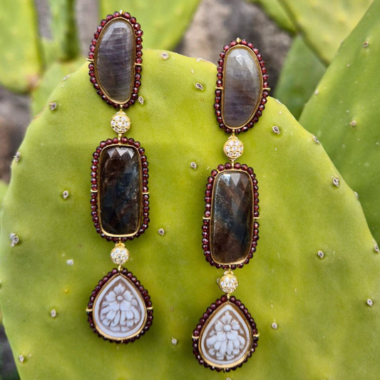 Orecchini in Argento 925 dorato con Cammei a goccia su Sardonica, Radice di Zaffiro e giri di Granato