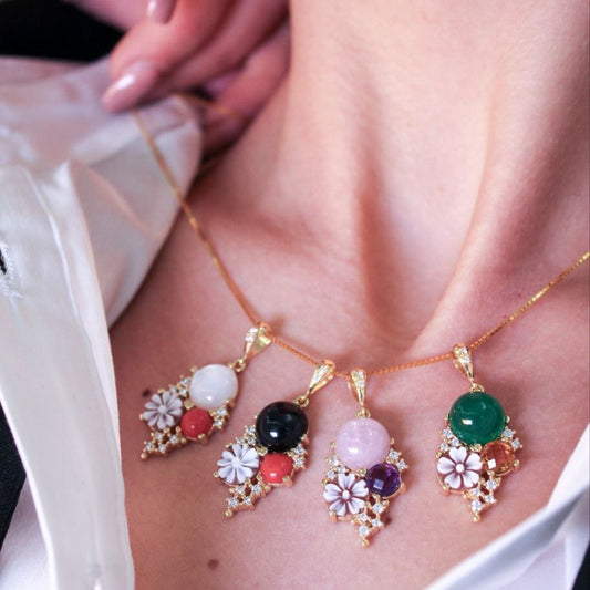 Ciondolo in Argento 925 dorato con Cammeo a fiore, Amazzonite e Corallo rosso, Modello Vanity