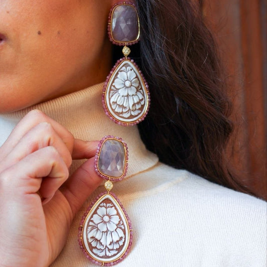 Orecchini in Argento 925 dorato con Cammei su Sardonica, Radice di Zaffiro e giri di Quarzi rosa