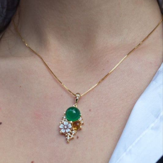 Ciondolo in Argento 925 dorato con Cammeo a fiore, Giada e Topazio giallo, Modello Vanity