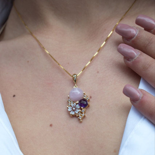 Ciondolo in Argento 925 dorato con Cammeo a fiore, Quarzo rosa e e Ametista, Modello Vanity