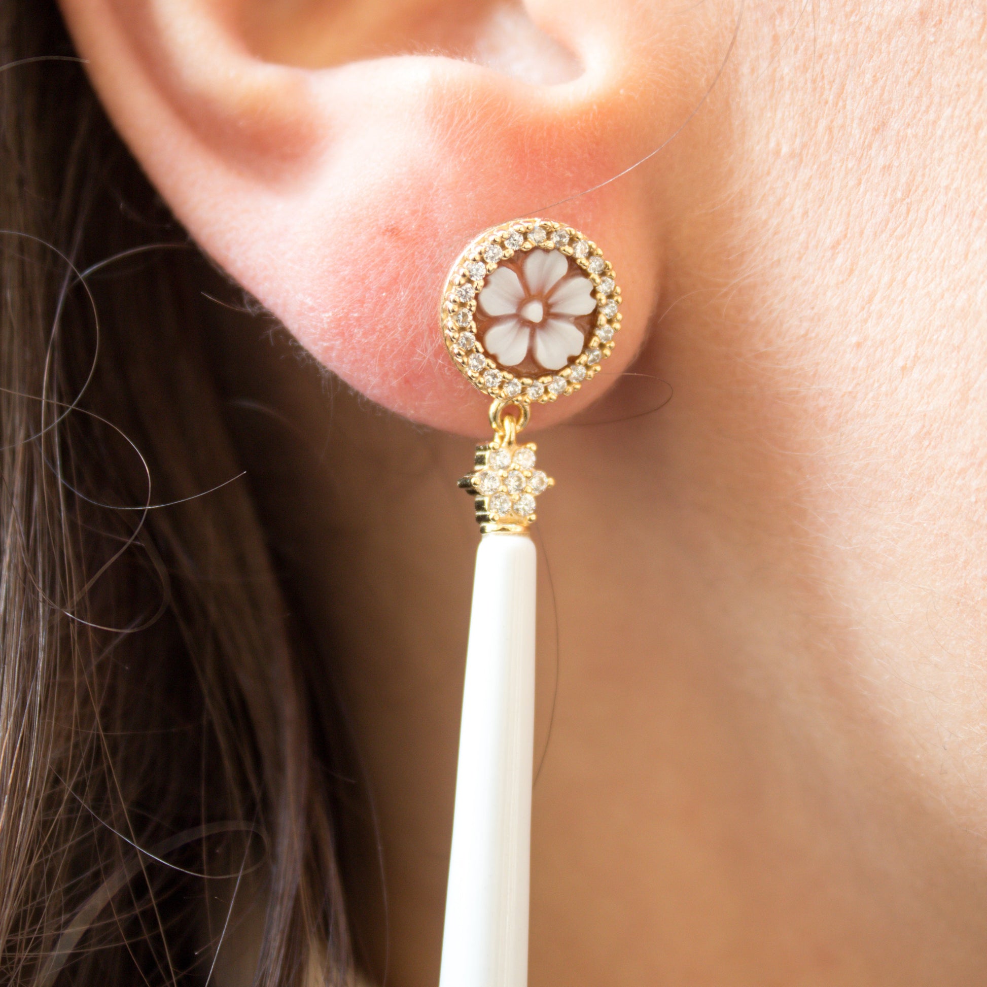 Orecchini in Argento 925 dorato con gocce lunghe in Bachelite bianca e bottoncino in Cammeo su Sardonica