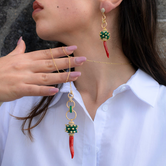 Orecchini in Argento 925 dorato asimmetrici con Corno in Corallo rosso Mediterraneo, mora con coroncine in Giada, e sfera con Spinelli neri in lavorazione Tessito
