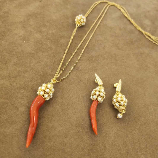 Collana in Argento 925 dorato con due mine in Corallo rosso Mediterraneo e Perla Scaramazza