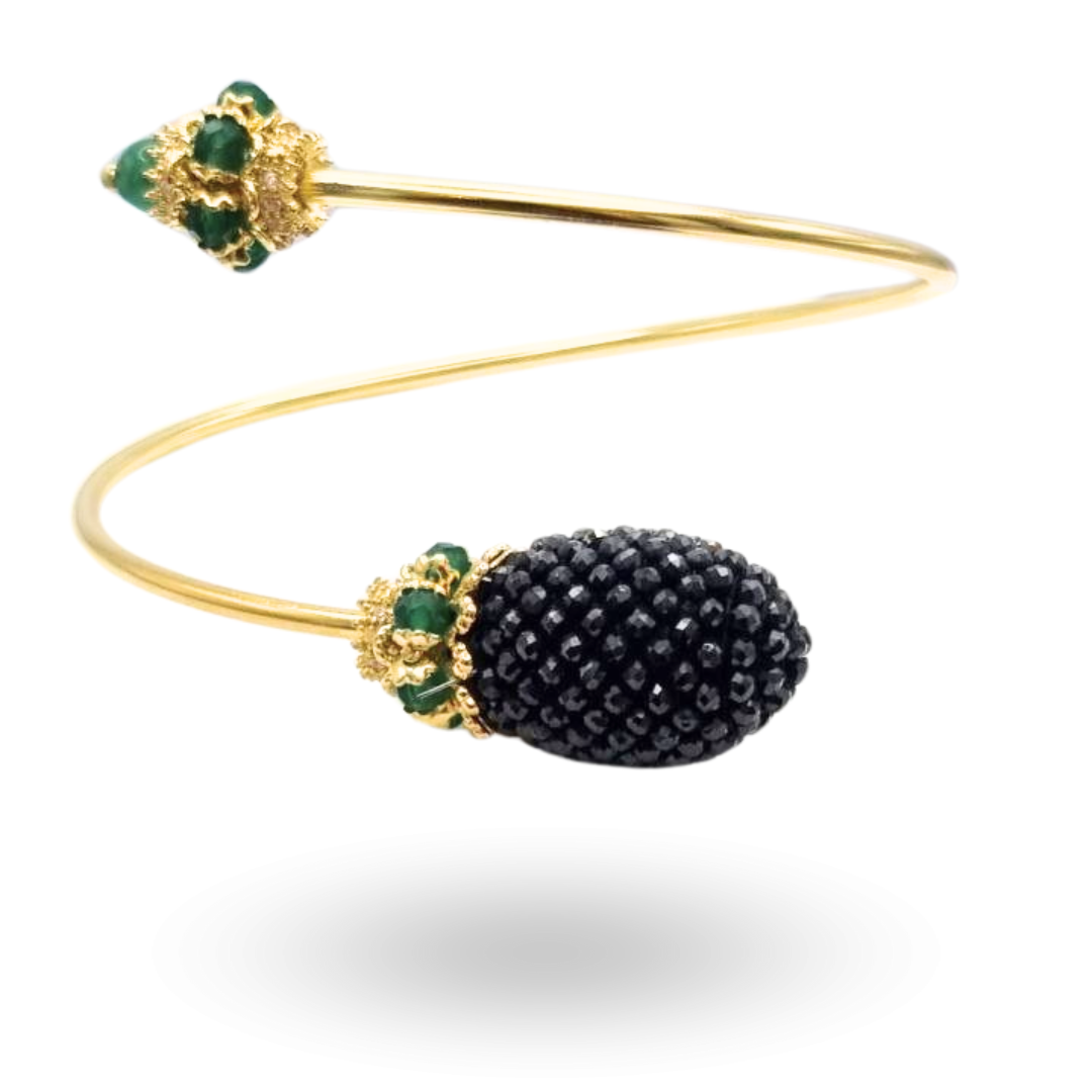 Bracciale tubolare semirigido in Argento 925 bagnato in Oro 18Kt con oliva in Spinelli neri lavorazione tessito e mina con coroncine in Giada. Disponibile anche con coroncine in Corallo, Perle, Spinelli neri, Lapis e Pasta di Turchese. Misura personalizzabile in base al proprio polso, senza supplemento.