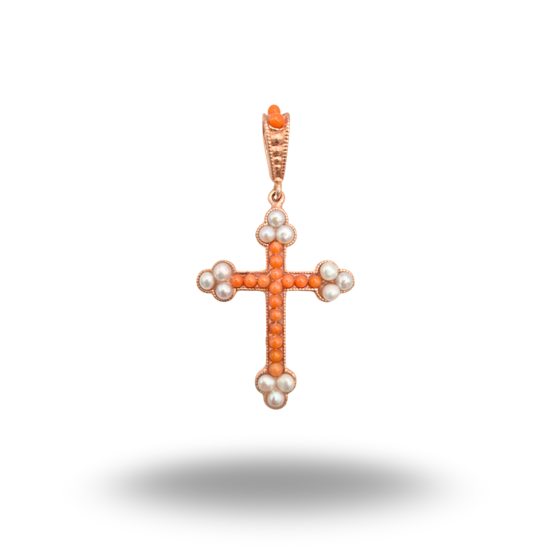 Ciondolo in Argento 925 rosato a Croce con Corallo di Sciacca e Perle