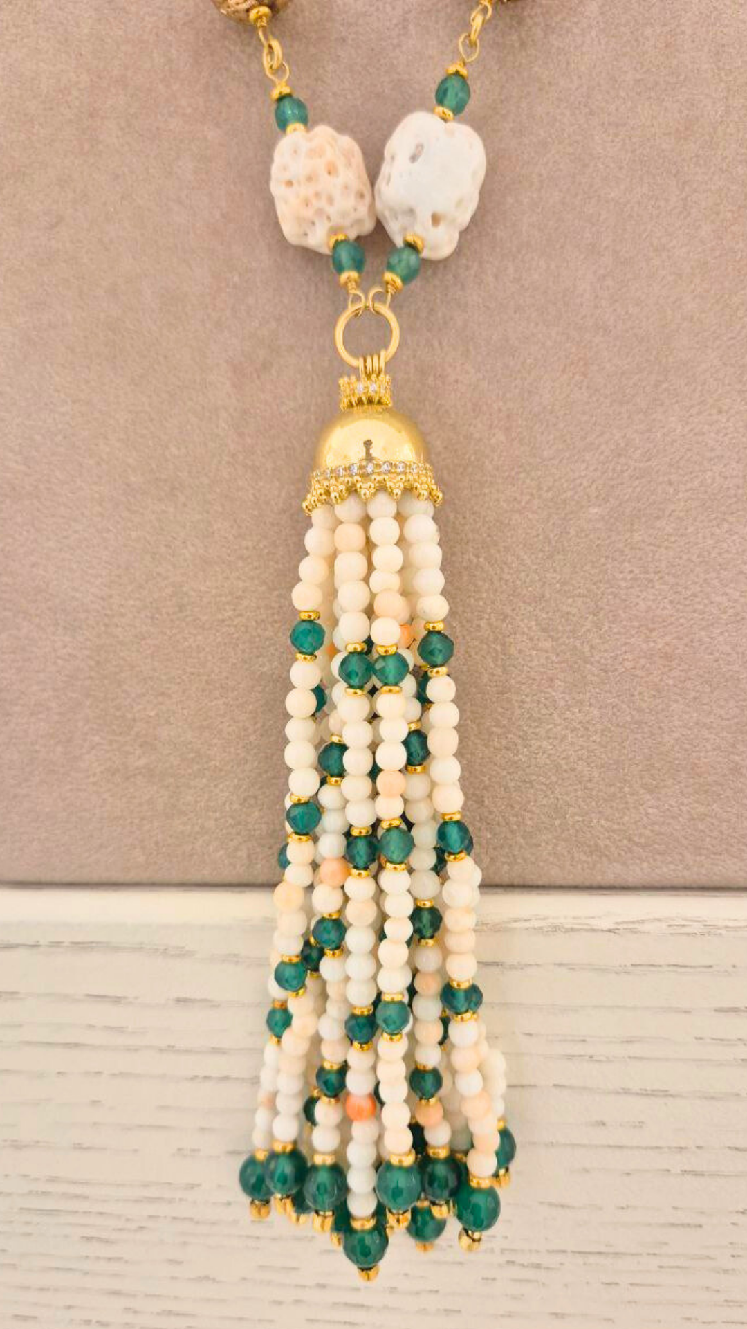 Collana in Pietre Naturali ammagliata completamente a mano, in Argento 925 bagnato in Oro 18Kt, con Corallo rosa e Giada. E' possibile sganciare il ciuffo dalla collana e dunque possono essere usati anche separatamente. Lunghezza collana 90cm, lunghezza ciuffo 15cm. Collezione MALA