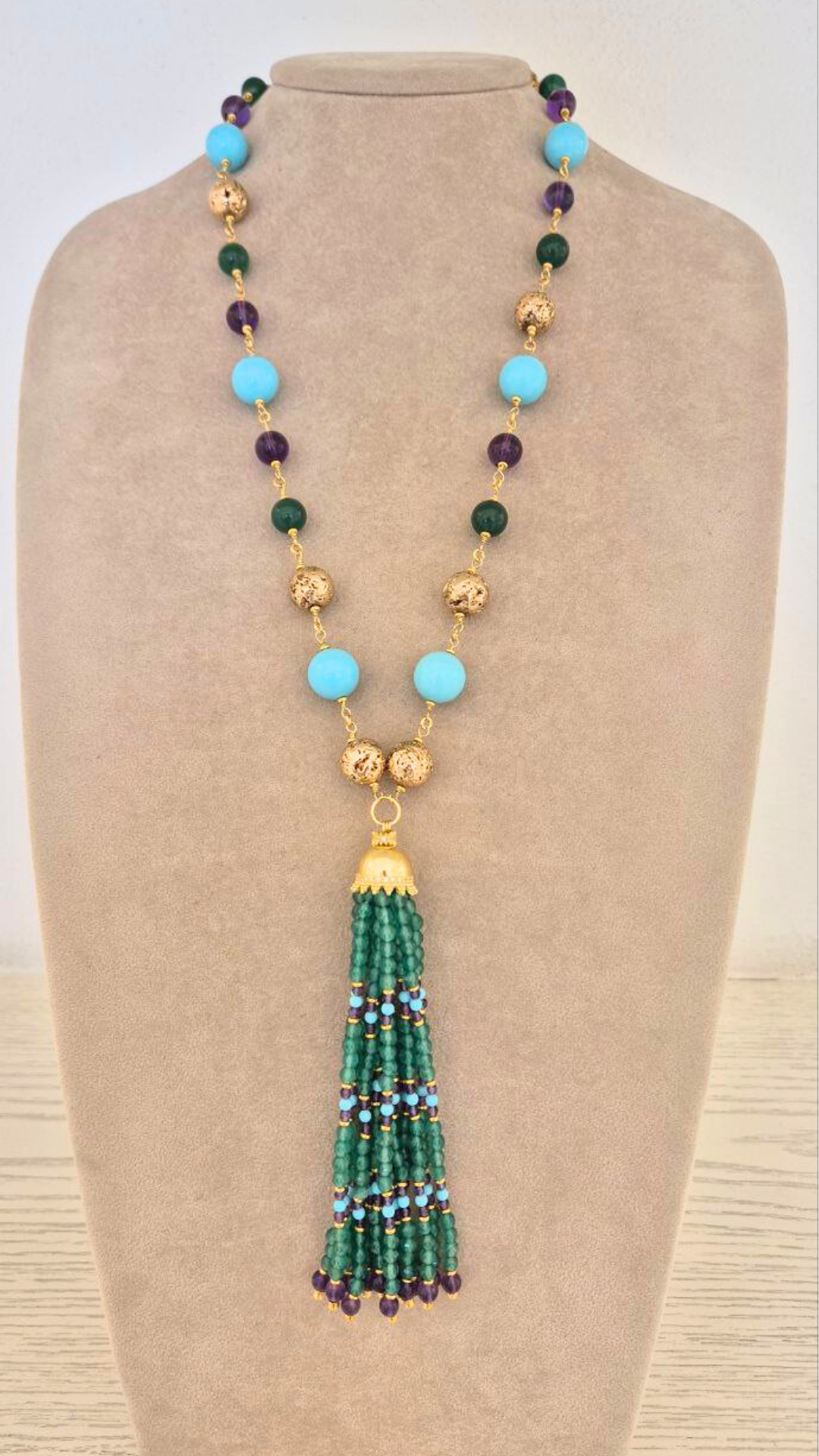 Collana in Pietre Naturali ammagliata completamente a mano, in Argento 925 bagnato in Oro 18Kt, con Pasta di Turchese, Pietra lavica, Giada e Ametista. E' possibile sganciare il ciuffo dalla collana e dunque possono essere usati anche separatamente. Lunghezza collana 70cm, lunghezza ciuffo 15cm. Collezione MALA
