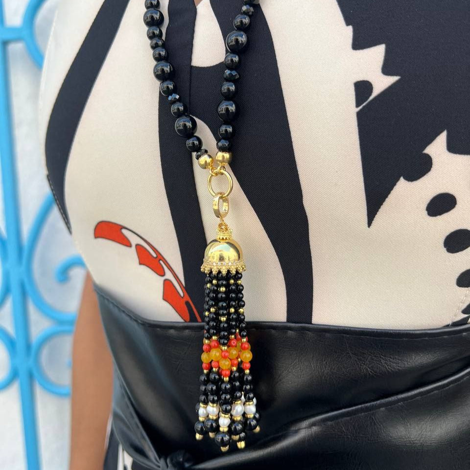Collana in Pietre Naturali con Onice, Corallo rosso Mediterraneo e Perle, montata in Argento 925 bagnato in Oro 18Kt. E' possibile sganciare il ciuffo dalla collana e dunque possono essere usati anche separatamente. Lunghezza collana 100cm, lunghezza ciuffo 15cm. Possibilità di indossarla anche con doppio giro intorno al collo. Collezione MALA
