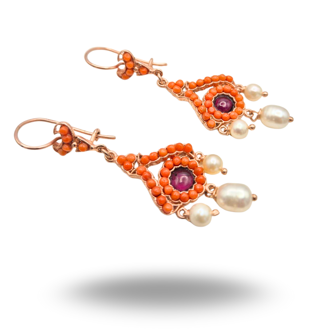 Orecchini in Argento 925 rosato in Corallo di Sciacca con tre Perle e Ametista centrale. Lunghezza 7cm