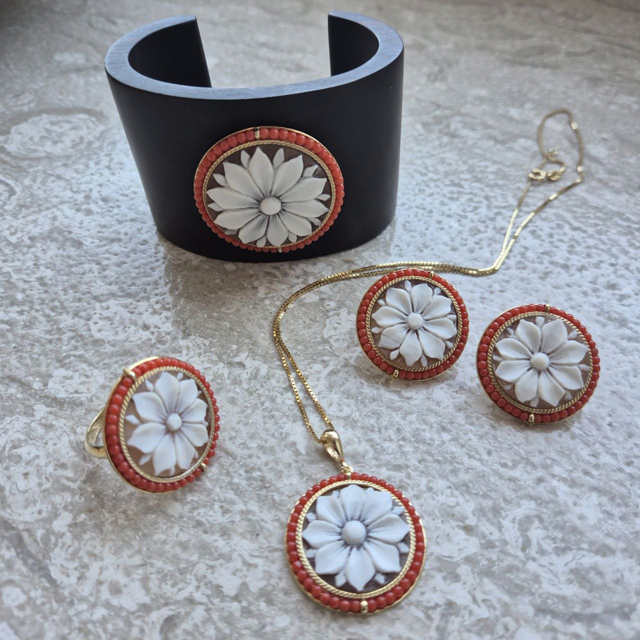 Anello in Argento 925 dorato con Cammeo floreale su Sardonica e giro in Corallo Rosso Mediterraneo