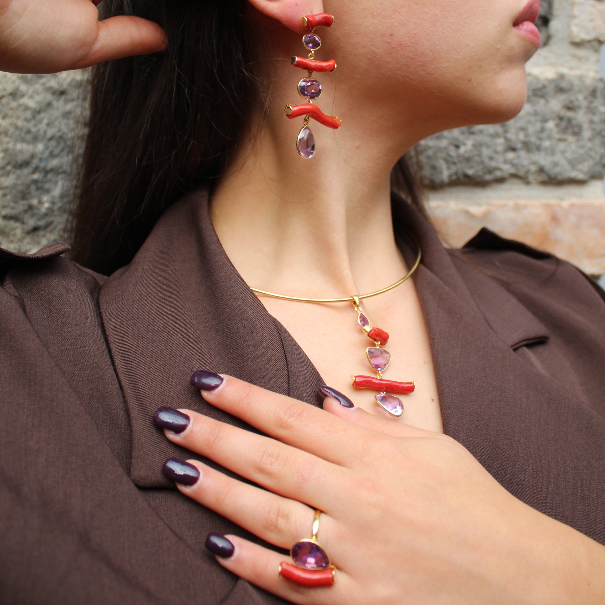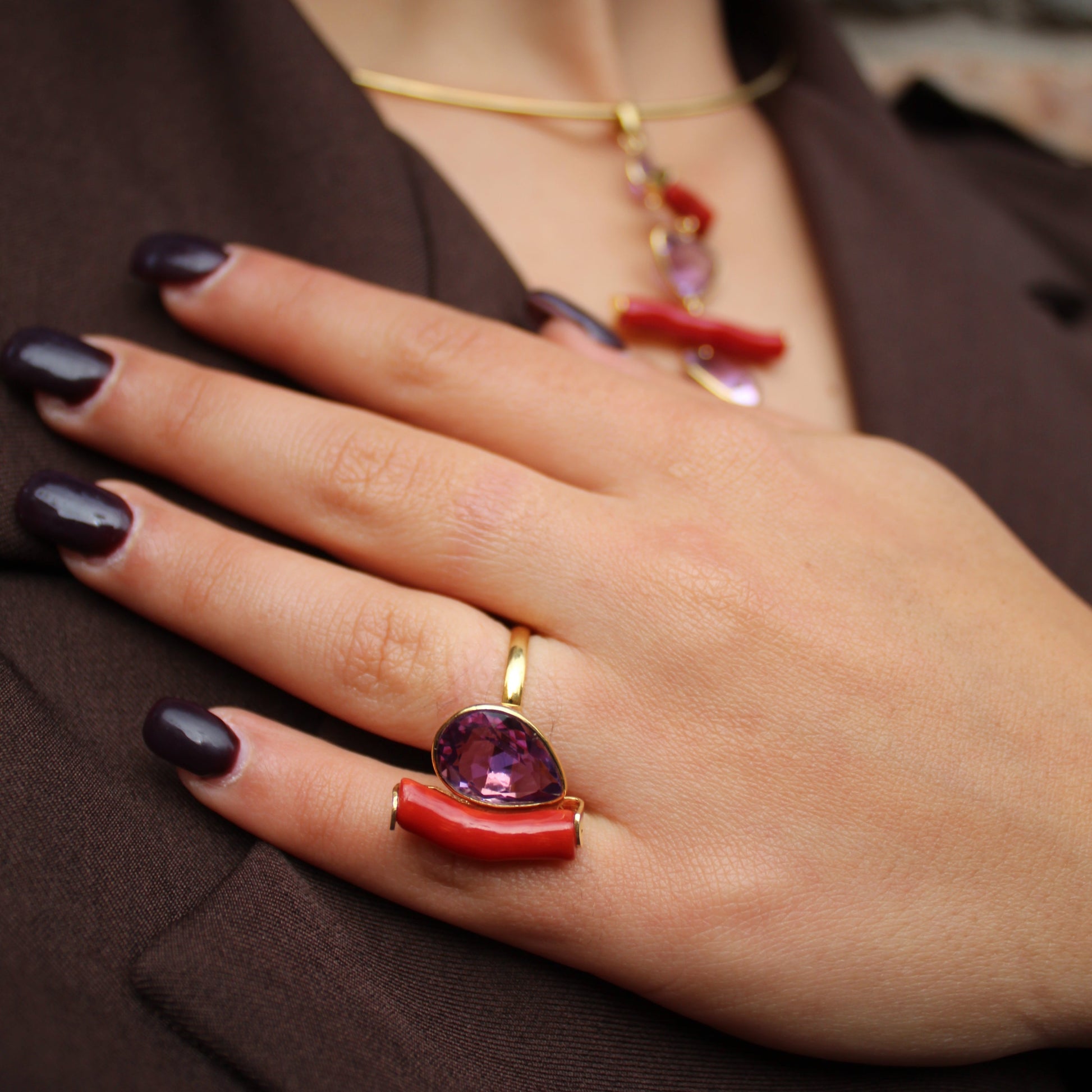 Anello in Argento 925 dorato con ramo di Corallo rosso e Ametista a goccia