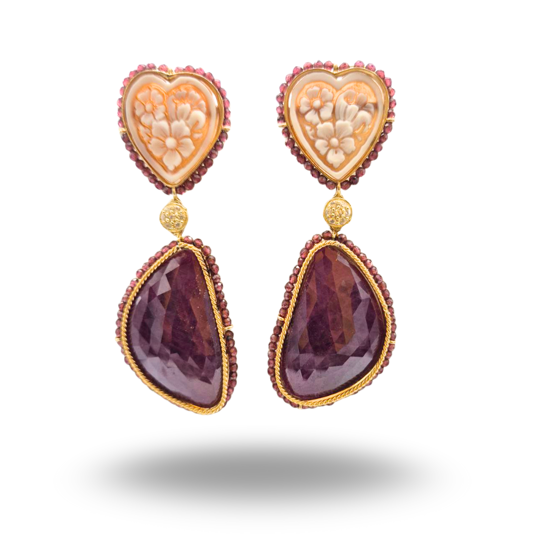Orecchini in Argento 925 bagnato in Oro 18Kt con Cammei a cuore su Sardonica, Radice di Rubino e giri di Granato. Lunghezza 7cm. Chiusura a perno